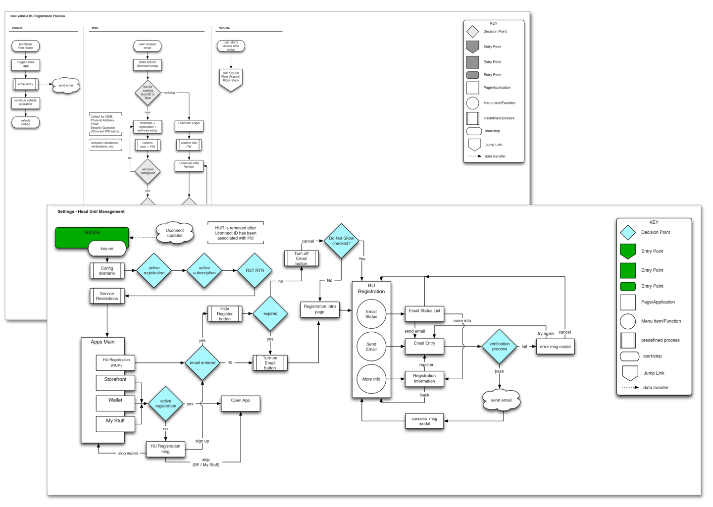 Working with the technical team I was able to understand the technical aspects which connect the vehicle to a cellular network. This was paramount in order to create the best possible user experience. The backend and front end processes across each channel needed to be mapped out for each experience to understand how they impact the user. This complexity needed to be hidden to provide a simple, elegant experience. These mapping exercises were completed for each app, feature and process.